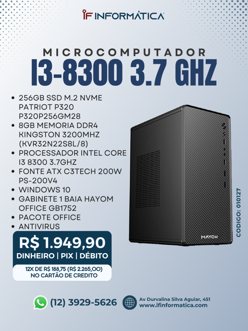 MICROCOMPUTADOR INTEL CORE I3 8300 3.7GHZ/8GB DDR4 3200MHZ/256GB SSD M.2/200W/WINDOWS 10